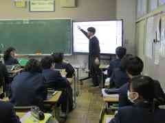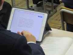 「ラジオDJのトークを聞いてみよう」という課題での学習です。電子黒板とタブレットを使用しながら学習が進んでいきます。