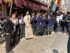 寄席公演観劇が終わり、劇場の前で写真撮影です。みんないい表情です。この後は班ごとになって行動します。